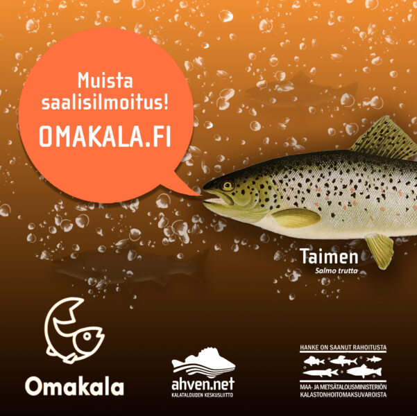 Vapaa-ajan kalastuksen saalis- ja pyyntitietojen ilmoittaminen on tullut pakolliseksi vuoden alusta seuraavien lajien ja kantojen osalta: taimen, järvilohi, ankerias, nieriä ja harjus. Mikäli saalis on taimen tai järvilohi tulee lisäksi ilmoittaa tieto rasvaevän leikkauksesta. Huomioi, että vapautetusta kalasta tulee ilmoittaa pituus vähintään viiden senttimetrin tarkkuudella.